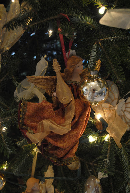 A close up of the gold themed ornaments, tons of angels and cherubs